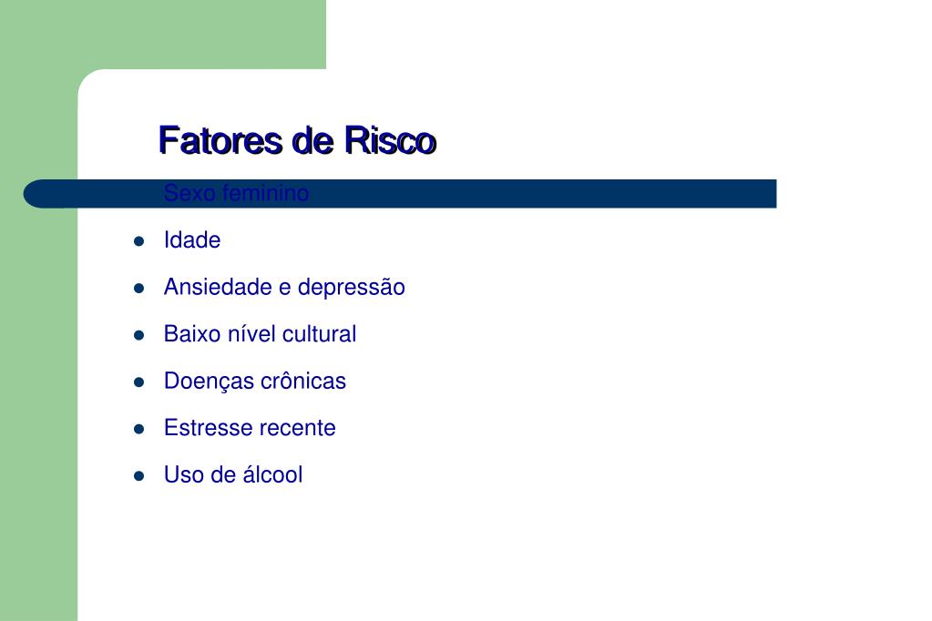 Sexo feminino Idade Ansiedade e depressão Baixo nível cultural Doenças crônicas Estresse recente Uso de álcool Fatores de Risco