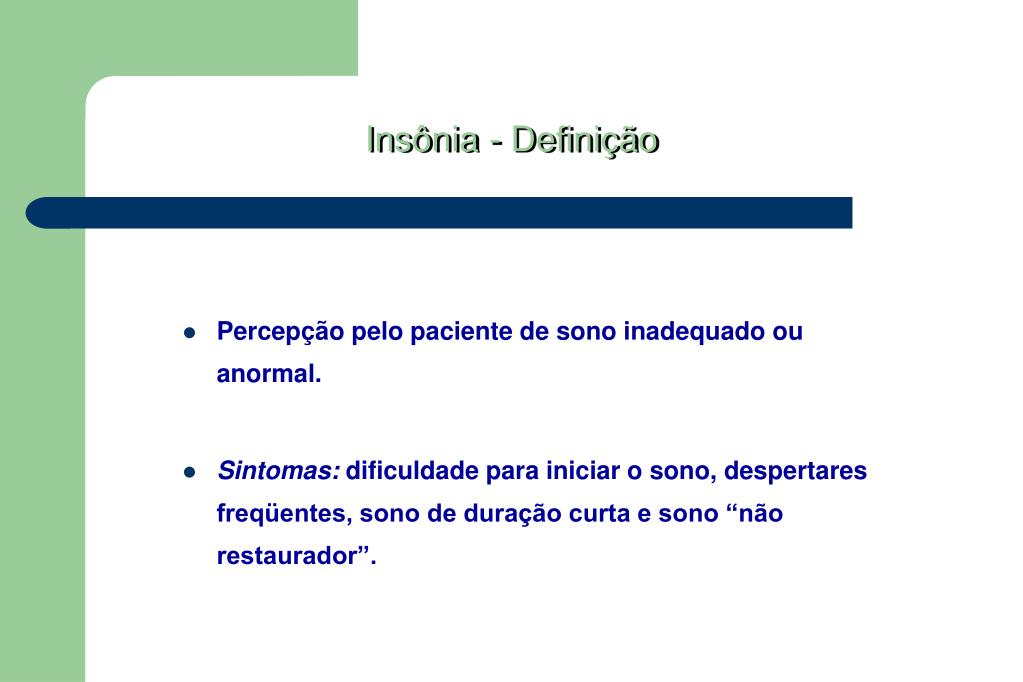 Insônia - Definição • Percepção pelo paciente de sono inadequado ou anormal. • Sintomas: dificuldade para iniciar o sono, despertares freqüentes, sono de duração curta e sono “não restaurador”.