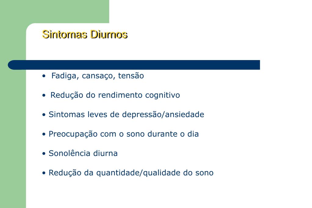 Sintomas Diurnos • Fadiga, cansaço, tensão • Redução do rendimento cognitivo • Sintomas leves de depressão/ansiedade • Preocupação com o sono durante o dia • Sonolência diurna • Redução da quantidade/qualidade do sono