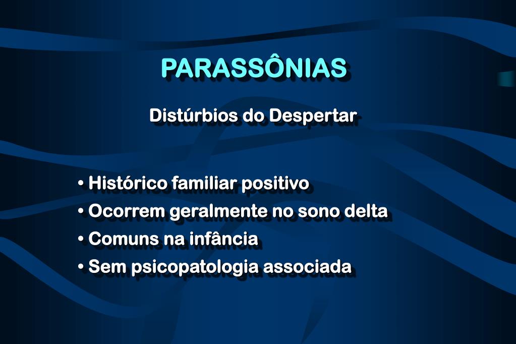 PARASSÔNIAS • Distúrbios do Despertar • Histórico familiar positivo • Ocorrem geralmente no sono delta • Comuns na infância • Sem psicopatologia associada