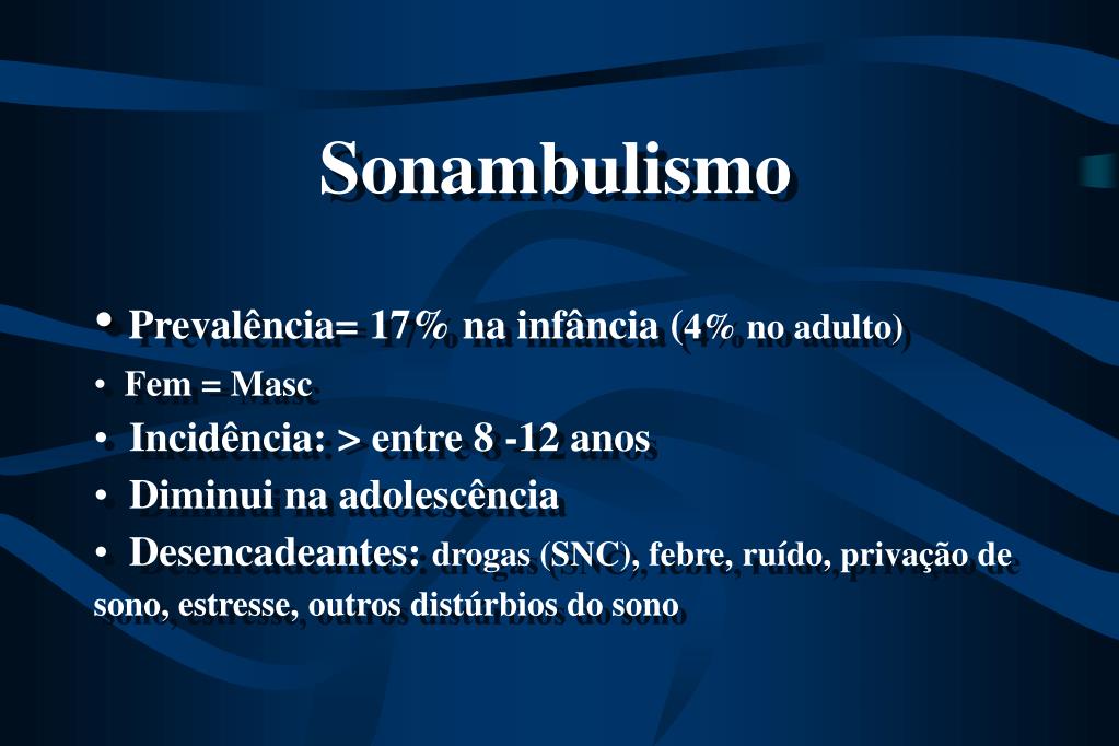 Sonambulismo • Comportamentos motores complexos durante o sono • Deambulação, acidentes, traumas • Primeira metade da noite ( 1as 3 hs do sono) • Duração de 10 minutos • Amnésia e confusão mental • Manifestações violentas ao acordar