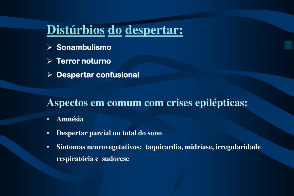 Distúrbiosdodespertar: • Sonambulismo • Terror noturno • Despertar confusional Aspectos em comum com crises epilépticas: • Amnésia • Despertar parcial ou total do sono • Sintomas neurovegetativos: taquicardia, midríase, irregularidade respiratória e sudorese