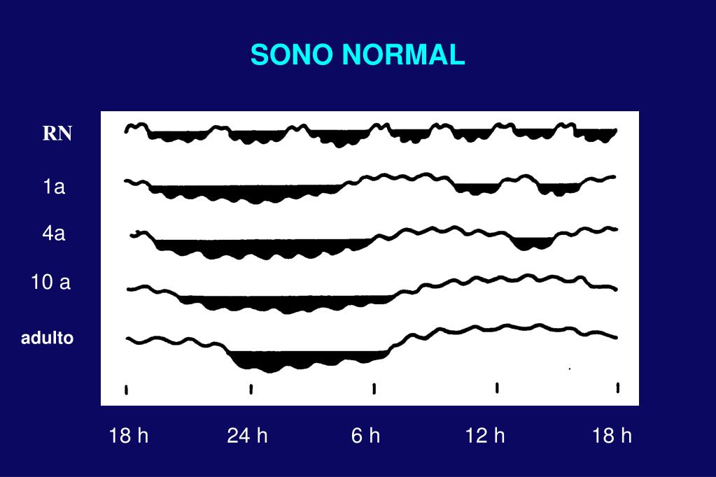 Introdução à Medicina do Sono. Distúrbios do Sono e Dor Rosana S. Cardoso Alves Departamento de Neurologia - Hospital das Clínicas da FMUSP Centro de Medicina Diagnóstica Fleury. SONO NORMAL. RN. 1a. 4a. 10 a. adulto. 18 h. 24 h. 6 h. 12 h. 18 h.