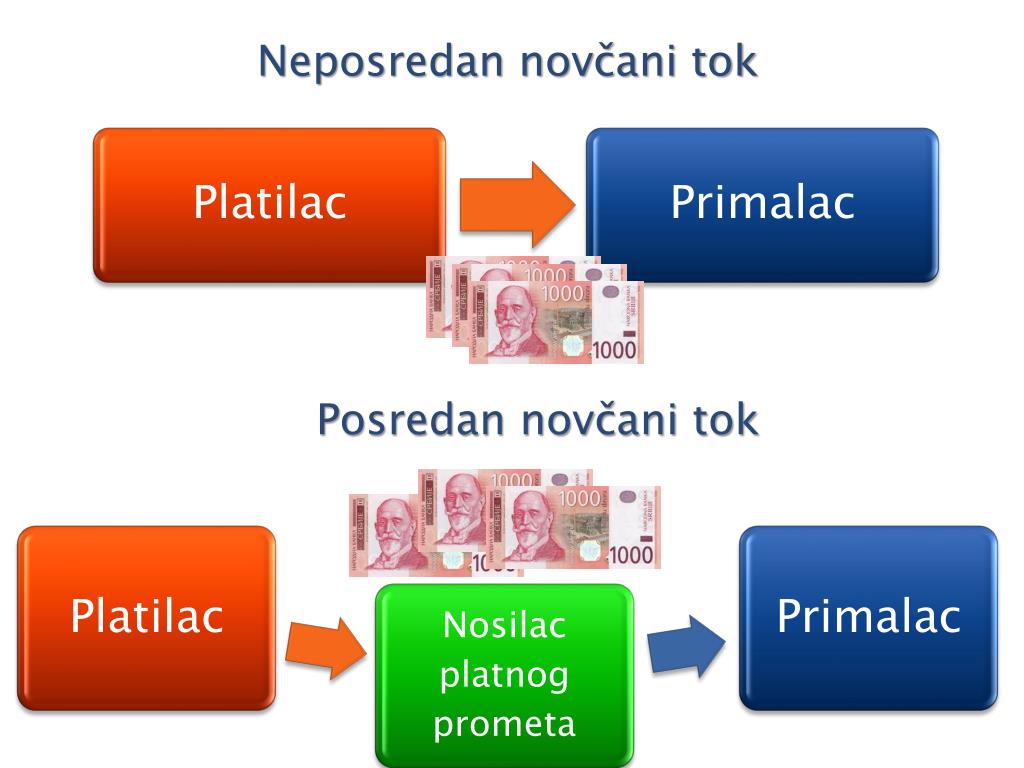 Pojam novčanog toka • Plaćanje se može izvršiti neposredno između dva učesnika i tada se uspostavlja neposredan novčani tok. • Ova vrsta plaćanja se obavlja svakodnevno, na primer: kupujemo sveže voće na pijaci i odmah plaćamo prodavcu kupljenu robu. • Plaćanje se može izvršiti između subjekata preko posrednika (nosioca platnog prometa) i to banke. Takva vrsta novčanog toka naziva se posredan novčani tok.