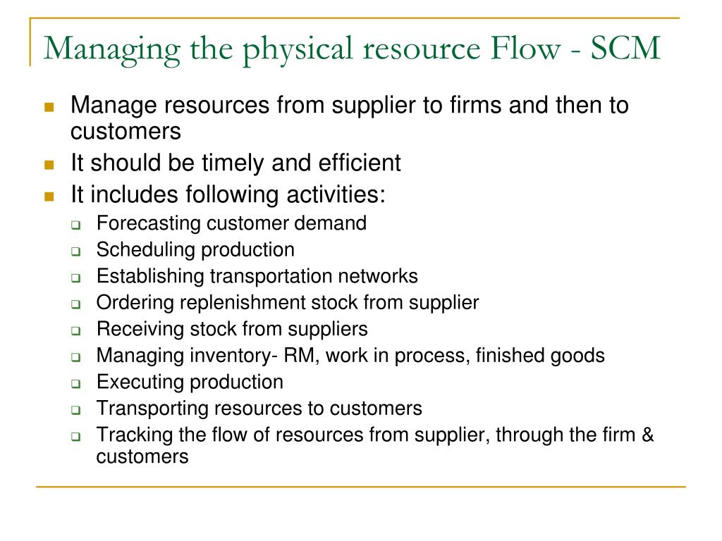 Managing the physical resource Flow - SCM • Manage resources from supplier to firms and then to customers • It should be timely and efficient • It includes following activities: • Forecasting customer demand • Scheduling production • Establishing transportation networks • Ordering replenishment stock from supplier • Receiving stock from suppliers • Managing inventory- RM, work in process, finished goods • Executing production • Transporting resources to customers • Tracking the flow of resources from supplier, through the firm & customers