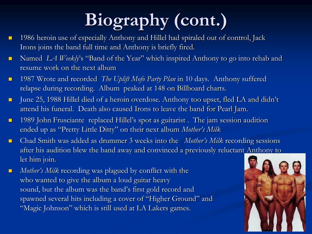 Biography (cont.) 1986 heroin use of especially Anthony and Hillel had spiraled out of control, Jack Irons joins the band full time and Anthony is briefly fired. Named LA Weekly’s “Band of the Year” which inspired Anthony to go into rehab and resume work on the next album 1987 Wrote and recorded The Uplift Mofo Party Plan in 10 days. Anthony suffered relapse during recording. Album peaked at 148 on Billboard charts. June 25, 1988 Hillel died of a heroin overdose. Anthony too upset, fled LA and didn’t attend his funeral. Death also caused Irons to leave the band for Pearl Jam. 1989 John Frusciante replaced Hillel’s spot as guitarist . The jam session audition ended up as “Pretty Little Ditty” on their next album Mother’s Milk Chad Smith was added as drummer 3 weeks into the Mother’s Milk recording sessions after his audition blew the band away and convinced a previously reluctant Anthony to let him join. Mother’s Milk recording was plagued by conflict with the producer who wanted to give the album a loud guitar heavy metal sound, but the album was the band’s first gold record and spawned several hits including a cover of “Higher Ground” and “Magic Johnson” which is still used at LA Lakers games.