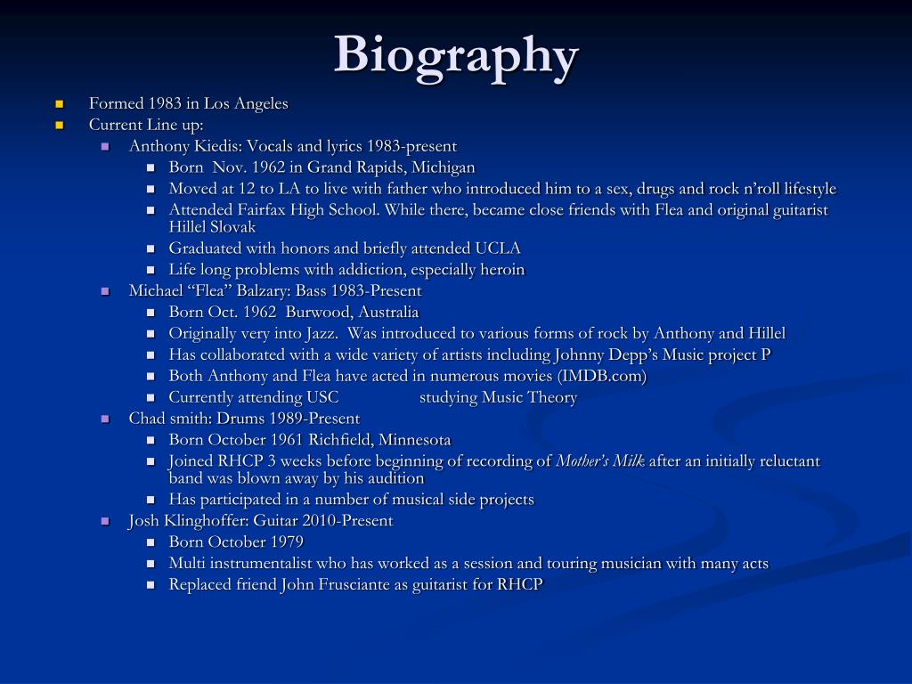 Biography (cont.) Formed 1983. Founding members were Anthony Kiedis, Hillel Slovak, Flea and Jack Irons Originally called Tony Flow & the Miraculously Majestic Masters of Mayhem After the huge success of their 1st performance at the Rhythm Lounge which was originally intended to be a one off performance, changed name to Red Hot Chili Peppers After playing shows for several months around LA where they developed their ‘high energy, wearing nothing but a sock performances’, they were signed to EMI August 1984 Debut Album The Red Hot Chili Peppers to mild success on MTV and college radio, but the band felt the album was too polished 1986 released the George Clinton produced Freaky Styley which incorporated strong funk influences. Only mildly successful, but spawned a few movie cameos