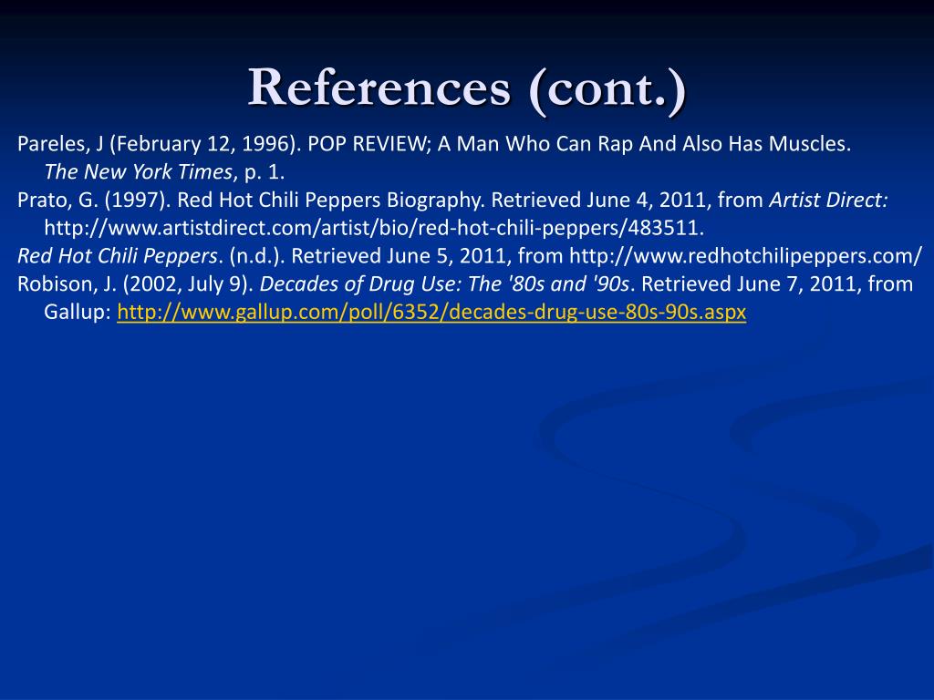 References (cont.) Pareles, J (February 12, 1996). POP REVIEW; A Man Who Can Rap And Also Has Muscles. The New York Times, p. 1. Prato, G. (1997). Red Hot Chili Peppers Biography. Retrieved June 4, 2011, from Artist Direct: http://www.artistdirect.com/artist/bio/red-hot-chili-peppers/483511. Red Hot Chili Peppers. (n.d.). Retrieved June 5, 2011, from http://www.redhotchilipeppers.com/ Robison, J. (2002, July 9). Decades of Drug Use: The '80s and '90s. Retrieved June 7, 2011, from Gallup: http://www.gallup.com/poll/6352/decades-drug-use-80s-90s.aspx