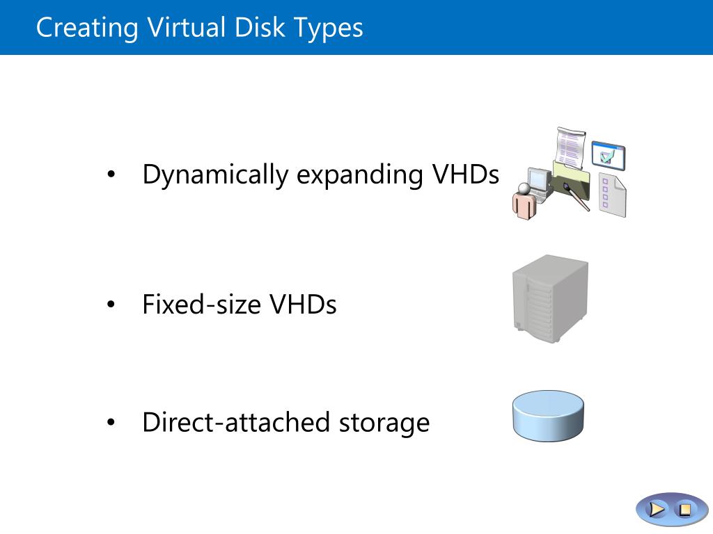 Creating Virtual Disk Types • Dynamically expanding VHDs • Fixed-size VHDs • Direct-attached storage