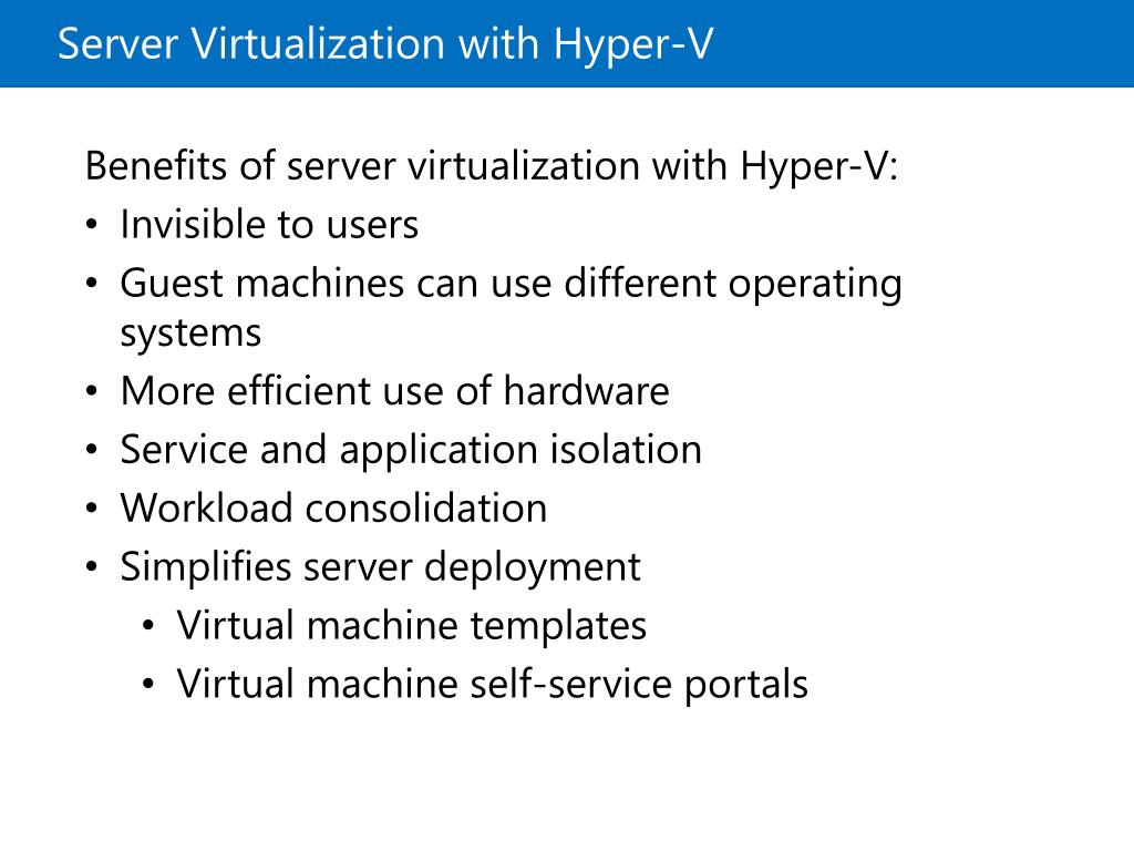 Server Virtualization with Hyper-V • Benefits of server virtualization with Hyper-V: • Invisible to users • Guest machines can use different operating systems • More efficient use of hardware • Service and application isolation • Workload consolidation • Simplifies server deployment • Virtual machine templates • Virtual machine self-service portals