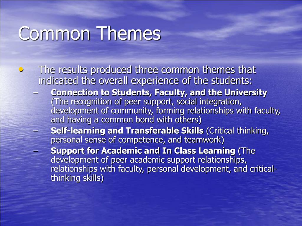 Common Themes • The results produced three common themes that indicated the overall experience of the students: • Connection to Students, Faculty, and the University (The recognition of peer support, social integration, development of community, forming relationships with faculty, and having a common bond with others) • Self-learning and Transferable Skills (Critical thinking, personal sense of competence, and teamwork) • Support for Academic and In Class Learning (The development of peer academic support relationships, relationships with faculty, personal development, and critical-thinking skills)