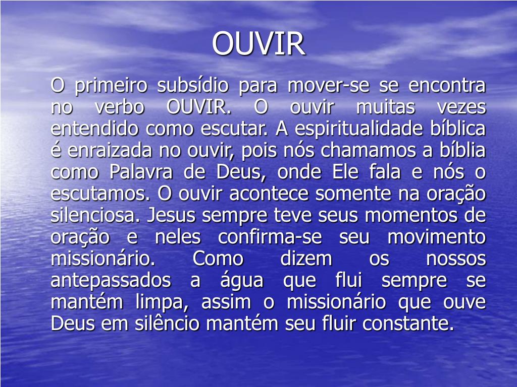 OUVIR O primeiro subsídio para mover-se se encontra no verbo OUVIR. O ouvir muitas vezes entendido como escutar. A espiritualidade bíblica é enraizada no ouvir, pois nós chamamos a bíblia como Palavra de Deus, onde Ele fala e nós o escutamos. O ouvir acontece somente na oração silenciosa. Jesus sempre teve seus momentos de oração e neles confirma-se seu movimento missionário. Como dizem os nossos antepassados a água que flui sempre se mantém limpa, assim o missionário que ouve Deus em silêncio mantém seu fluir constante.