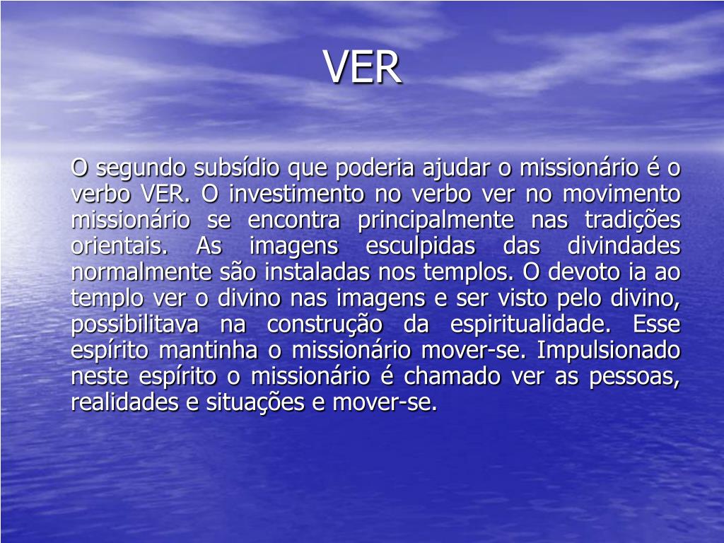 VER O segundo subsídio que poderia ajudar o missionário é o verbo VER. O investimento no verbo ver no movimento missionário se encontra principalmente nas tradições orientais. As imagens esculpidas das divindades normalmente são instaladas nos templos. O devoto ia ao templo ver o divino nas imagens e ser visto pelo divino, possibilitava na construção da espiritualidade. Esse espírito mantinha o missionário mover-se. Impulsionado neste espírito o missionário é chamado ver as pessoas, realidades e situações e mover-se.