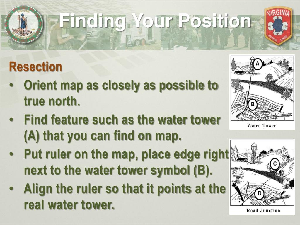 Finding Your Position Modified Resection If you know that you are located somewhere along a certain linear feature on the map such as a road or riverbank, then you can use an easier method to pinpoint your location—a method called “modified resection.” First, orient your map. Locate a feature that you can also find on the map, such as water tower in previous example.