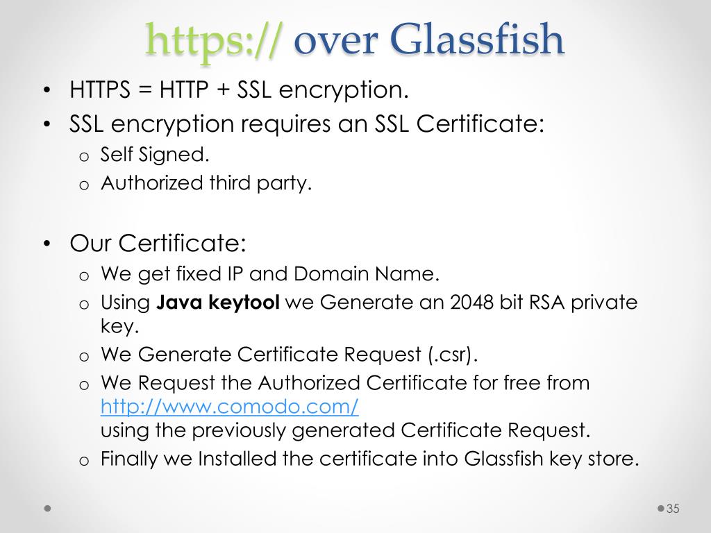 https:// over Glassfish • HTTPS = HTTP + SSL encryption. • SSL encryption requires an SSL Certificate: • Self Signed. • Authorized third party. • Our Certificate: • We get fixed IP and Domain Name. • Using Java keytoolwe Generate an 2048 bit RSA private key. • We Generate Certificate Request (.csr). • We Request the Authorized Certificate for free from http://www.comodo.com/using the previously generated Certificate Request. • Finally we Installed the certificate into Glassfish key store.