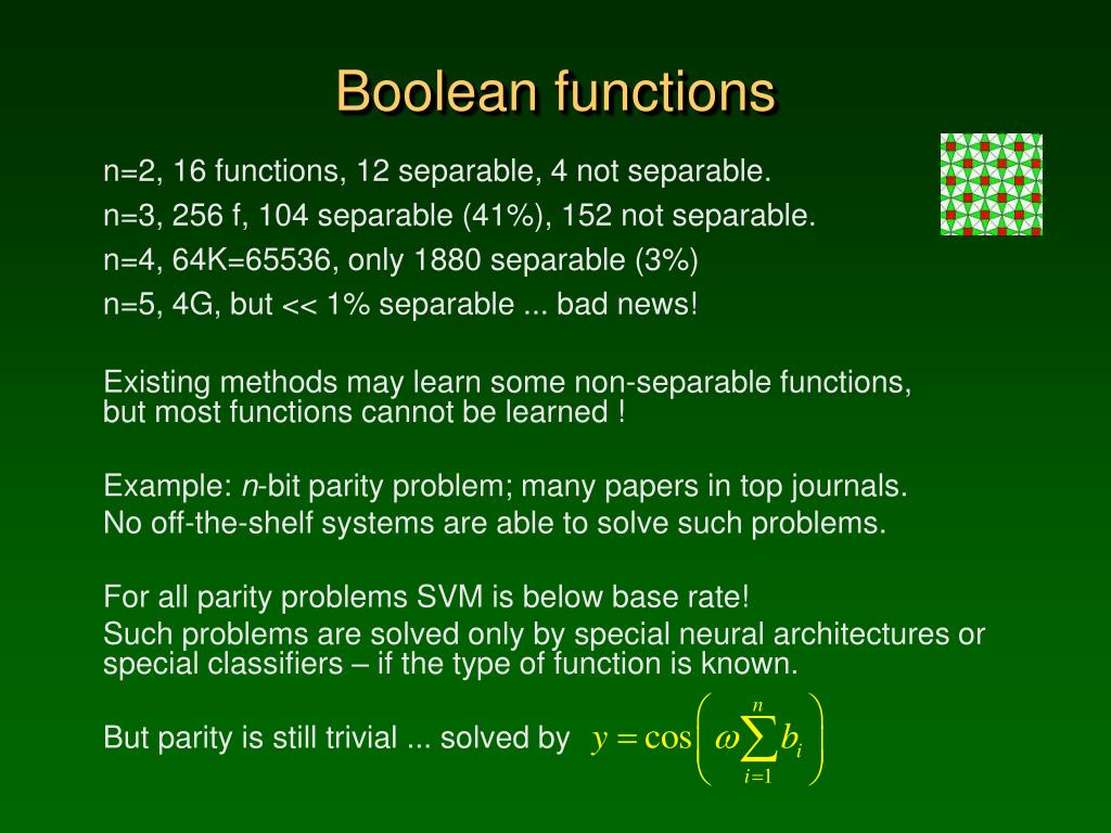 Boolean functions n=2, 16 functions, 12 separable, 4 not separable. n=3, 256 f, 104 separable (41%), 152 not separable. n=4, 64K=65536, only 1880 separable (3%) n=5, 4G, but << 1% separable ... bad news! Existing methods may learn some non-separable functions, but most functions cannot be learned ! Example: n-bit parity problem; many papers in top journals. No off-the-shelf systems are able to solve such problems. For all parity problems SVM is below base rate! Such problems are solved only by special neural architectures or special classifiers – if the type of function is known. But parity is still trivial ... solved by