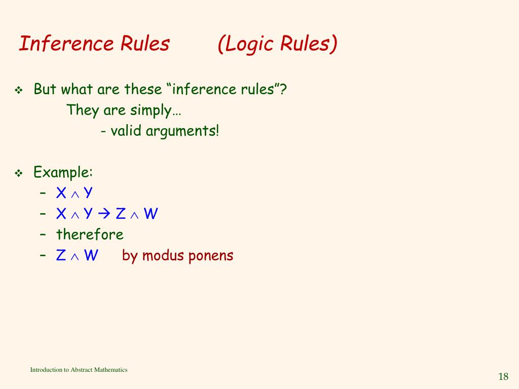 Inference Rules (Logic Rules) • But what are these “inference rules”? They are simply… - valid arguments! • Example: • X Y • X Y Z W • therefore • Z Wby modus ponens