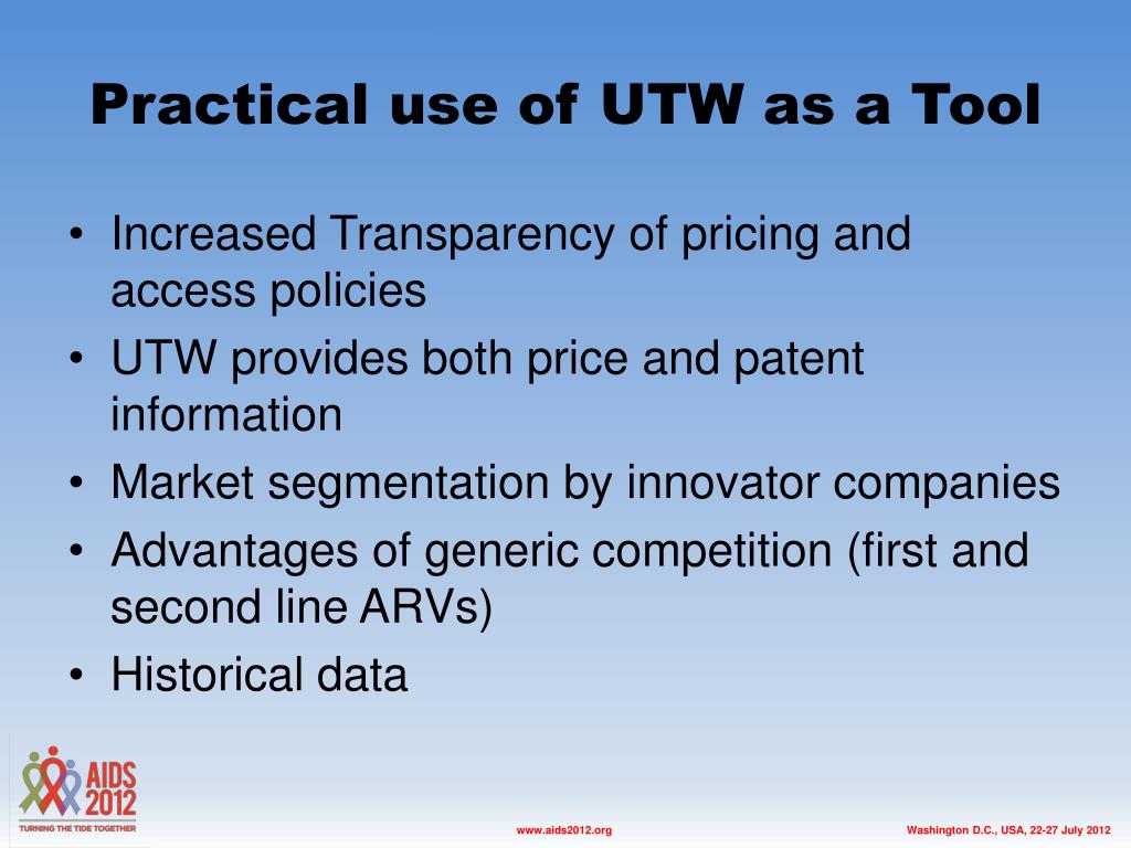 Practical use of UTW as a Tool • Increased Transparency of pricing and access policies • UTW provides both price and patent information • Market segmentation by innovator companies • Advantages of generic competition (first and second line ARVs) • Historical data
