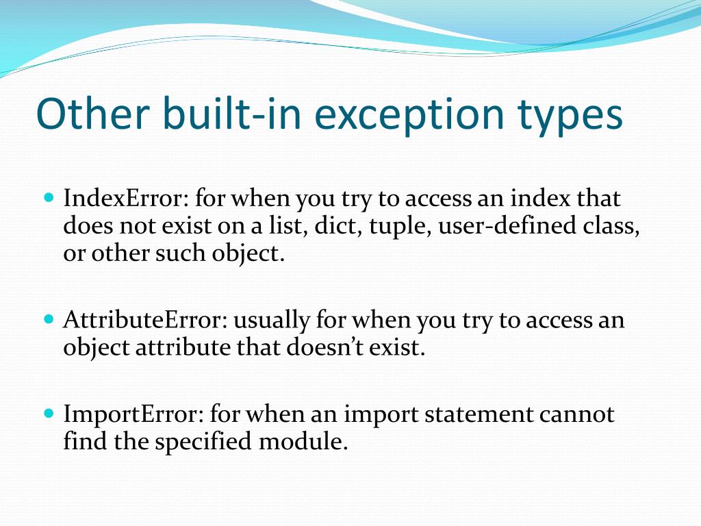 Other built-in exception types • IndexError: for when you try to access an index that does not exist on a list, dict, tuple, user-defined class, or other such object. • AttributeError: usually for when you try to access an object attribute that doesn’t exist. • ImportError: for when an import statement cannot find the specified module.