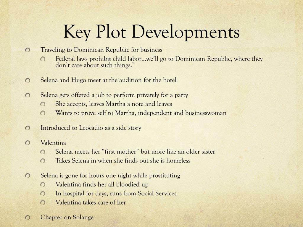 Key Plot Developments • Traveling to Dominican Republic for business • Federal laws prohibit child labor…we’ll go to Dominican Republic, where they don’t care about such things.” • Selena and Hugo meet at the audition for the hotel • Selena gets offered a job to perform privately for a party • She accepts, leaves Martha a note and leaves • Wants to prove self to Martha, independent and businesswoman • Introduced to Leocadio as a side story • Valentina • Selena meets her “first mother” but more like an older sister • Takes Selena in when she finds out she is homeless • Selena is gone for hours one night while prostituting • Valentina finds her all bloodied up • In hospital for days, runs from Social Services • Valentina takes care of her • Chapter on Solange