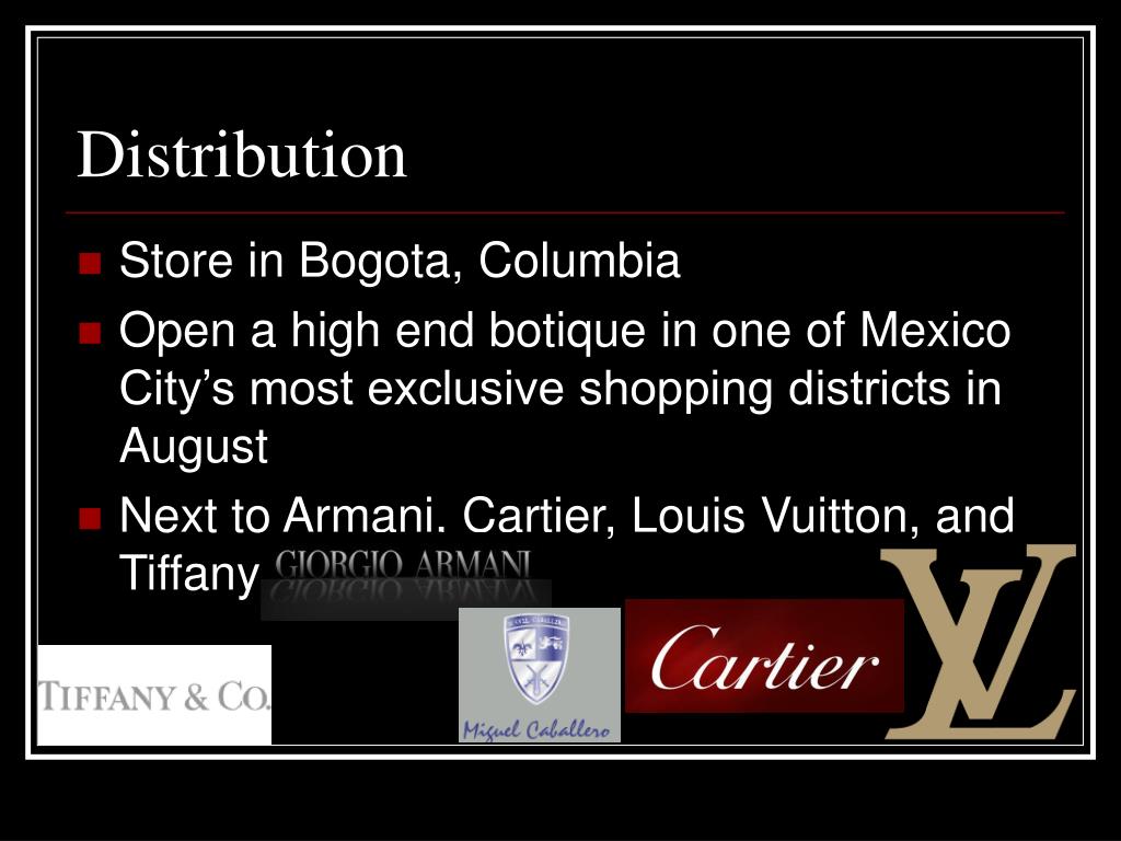 Distribution • Store in Bogota, Columbia • Open a high end botique in one of Mexico City’s most exclusive shopping districts in August • Next to Armani, Cartier, Louis Vuitton, and Tiffany