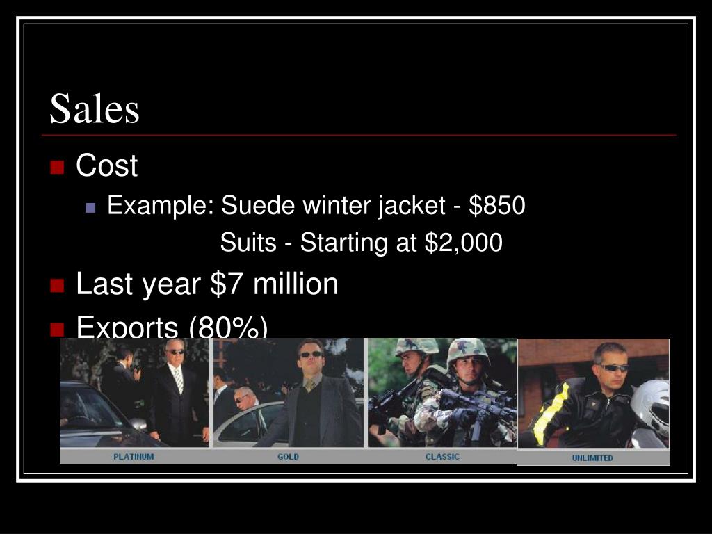 Sales • Cost • Example: Suede winter jacket - $850 Suits - Starting at $2,000 • Last year $7 million • Exports (80%)
