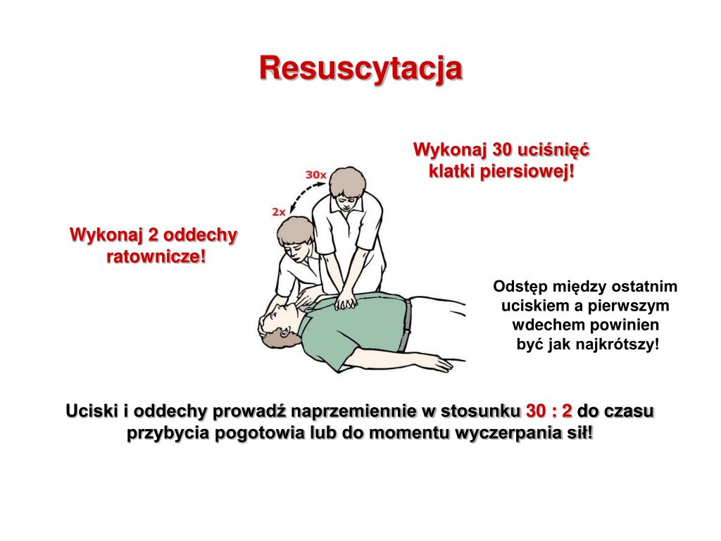 Resuscytacja Wykonaj 30 uciśnięć klatki piersiowej! Wykonaj 2 oddechy ratownicze! Odstęp między ostatnim uciskiem a pierwszym wdechem powinien być jak najkrótszy! Uciski i oddechy prowadź naprzemiennie w stosunku 30 : 2 do czasu przybycia pogotowia lub do momentu wyczerpania sił!