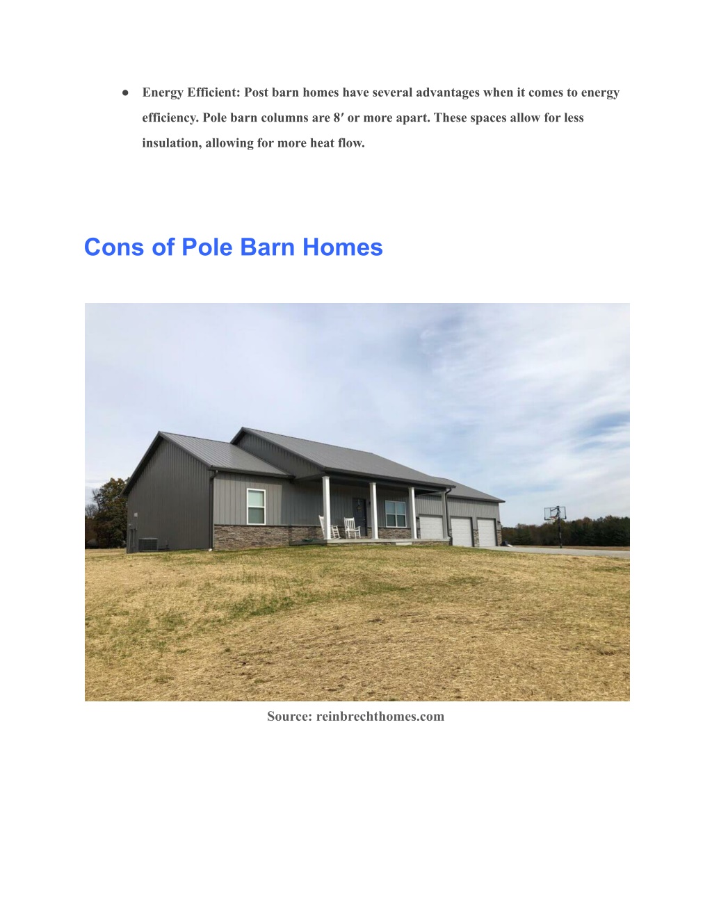● Energy Efficient: Post barn homes have several advantages when it comes to energy efficiency. Pole barn columns are 8′ or more apart. These spaces allow for less insulation, allowing for more heat flow. Cons of Pole Barn Homes Source: reinbrechthomes.com