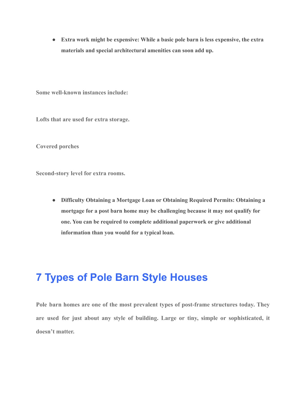 ● Extra work might be expensive: While a basic pole barn is less expensive, the extra materials and special architectural amenities can soon add up. Some well-known instances include: Lofts that are used for extra storage. Covered porches Second-story level for extra rooms. ● Difficulty Obtaining a Mortgage Loan or Obtaining Required Permits: Obtaining a mortgage for a post barn home may be challenging because it may not qualify for one. You can be required to complete additional paperwork or give additional information than you would for a typical loan. 7 Types of Pole Barn Style Houses Pole barn homes are one of the most prevalent types of post-frame structures today. They are used for just about any style of building. Large or tiny, simple or sophisticated, it doesn’t matter.