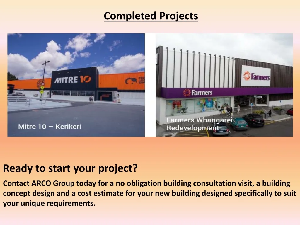 Completed Projects Ready to start your project? Contact ARCO Group today for a no obligation building consultation visit, a building concept design and a cost estimate for your new building designed specifically to suit your unique requirements.