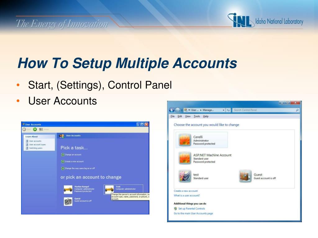 How To Setup Multiple Accounts • Start, (Settings), Control Panel • User Accounts