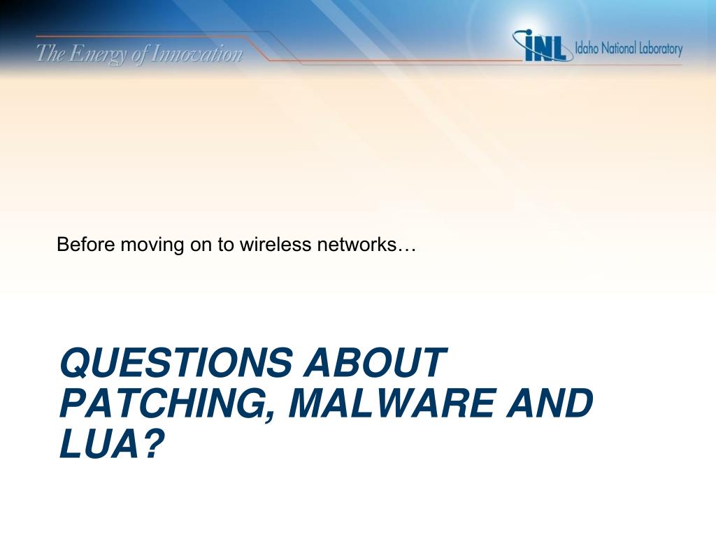 Before moving on to wireless networks… Questions about Patching, Malware and LUA?