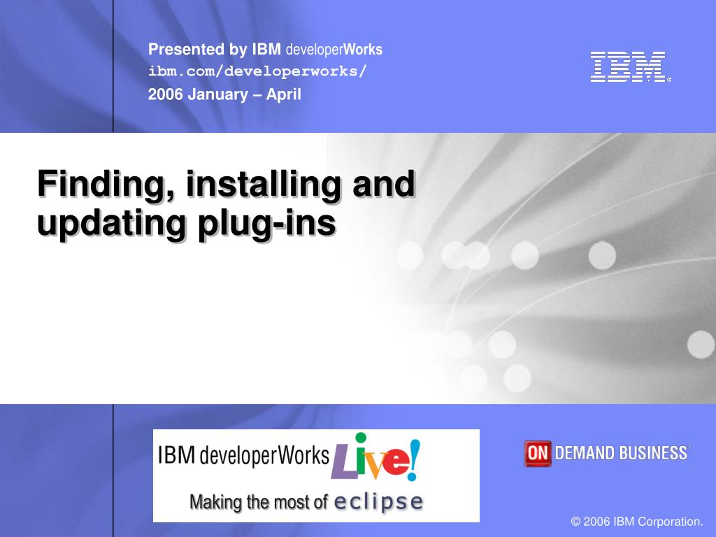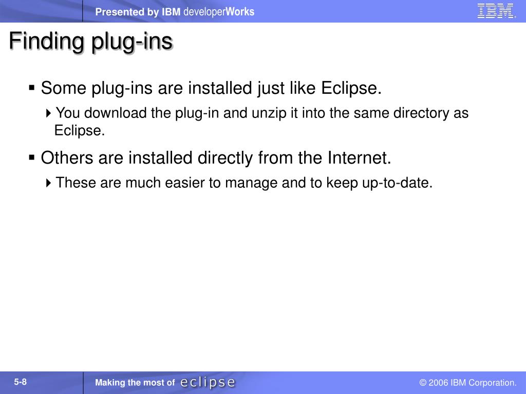 Installing plug-ins • The most primitive way to add a plug-in is to download and unzip a file containing a plug-in. • It works, but it requires the user to know how Eclipse is installed and configured. • The next time you start Eclipse, the workbench tries to load the plug-in. • You can cancel the installation if something goes wrong.