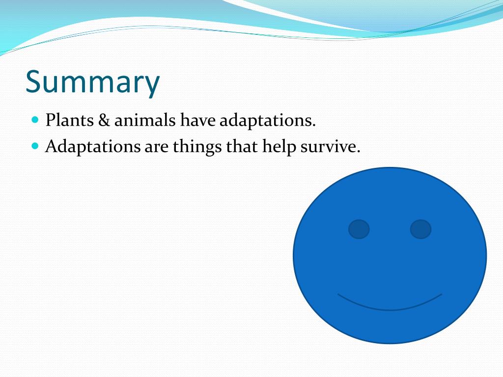 Summary • Plants & animals have adaptations. • Adaptations are things that help survive.