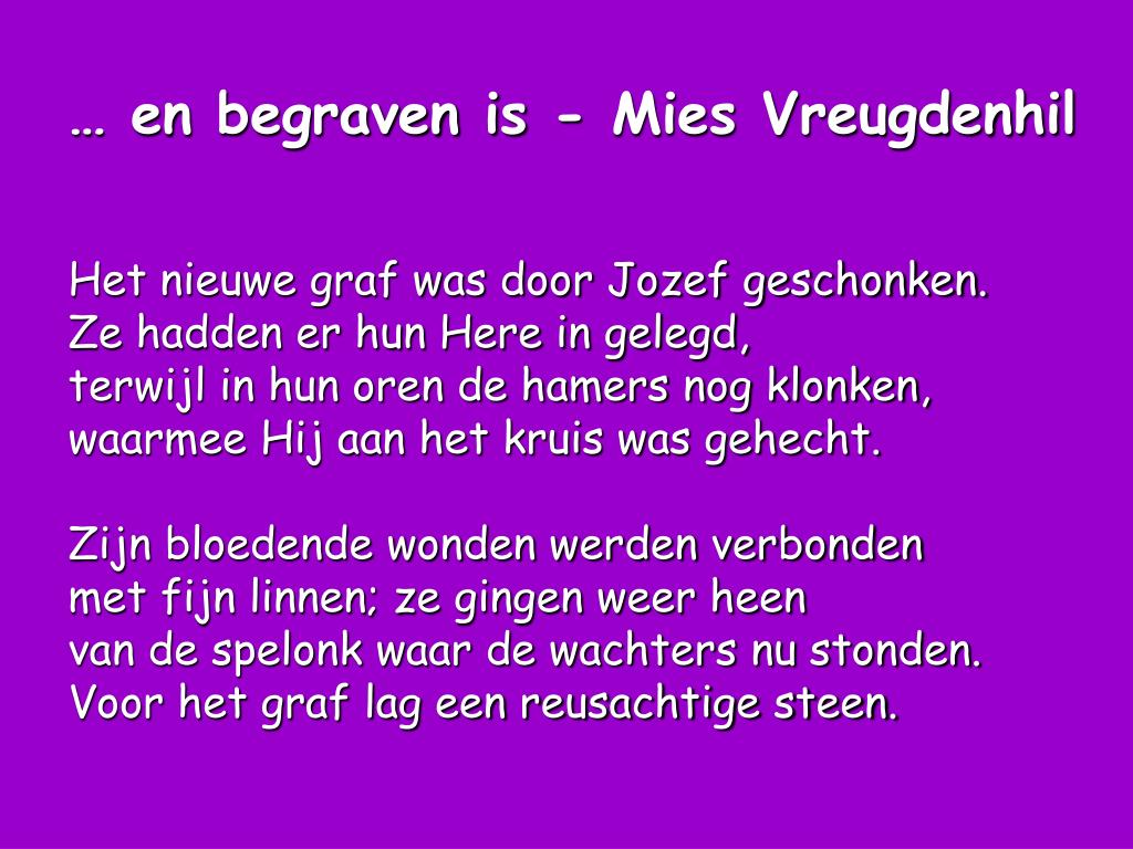 … en begraven is - Mies Vreugdenhil Het nieuwe graf was door Jozef geschonken. Ze hadden er hun Here in gelegd, terwijl in hun oren de hamers nog klonken, waarmee Hij aan het kruis was gehecht. Zijn bloedende wonden werden verbonden met fijn linnen; ze gingen weer heen van de spelonk waar de wachters nu stonden. Voor het graf lag een reusachtige steen.