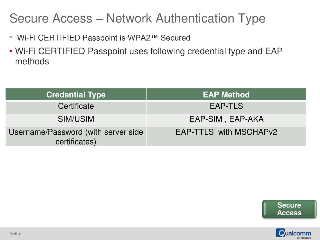 Secure Access – Network Authentication Type Secure Access • Wi-Fi CERTIFIED Passpoint is WPA2™ Secured • Wi-Fi CERTIFIED Passpoint uses following credential type and EAP methods