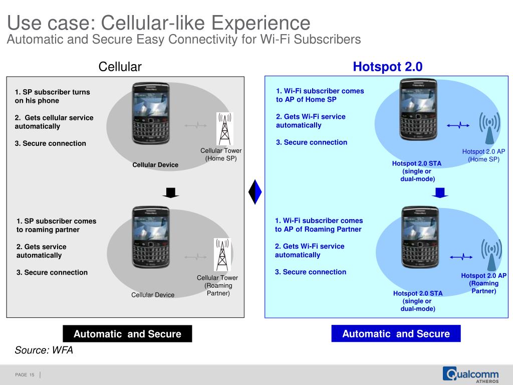 Use case: Cellular-like ExperienceAutomatic and Secure Easy Connectivity for Wi-Fi Subscribers Cellular Hotspot 2.0 1. Wi-Fi subscriber comes to AP of Home SP 2. Gets Wi-Fi service automatically 3. Secure connection 1. SP subscriber turns on his phone 2. Gets cellular service automatically 3. Secure connection Cellular Tower (Home SP) Hotspot 2.0 AP (Home SP) Hotspot 2.0 STA (single or dual-mode) Cellular Device 1. Wi-Fi subscriber comes to AP of Roaming Partner 2. Gets Wi-Fi service automatically 3. Secure connection 1. SP subscriber comes to roaming partner 2. Gets service automatically 3. Secure connection Hotspot 2.0 AP (Roaming Partner) Cellular Tower (Roaming Partner) Hotspot 2.0 STA (single or dual-mode) Cellular Device Automatic and Secure Automatic and Secure Source: WFA