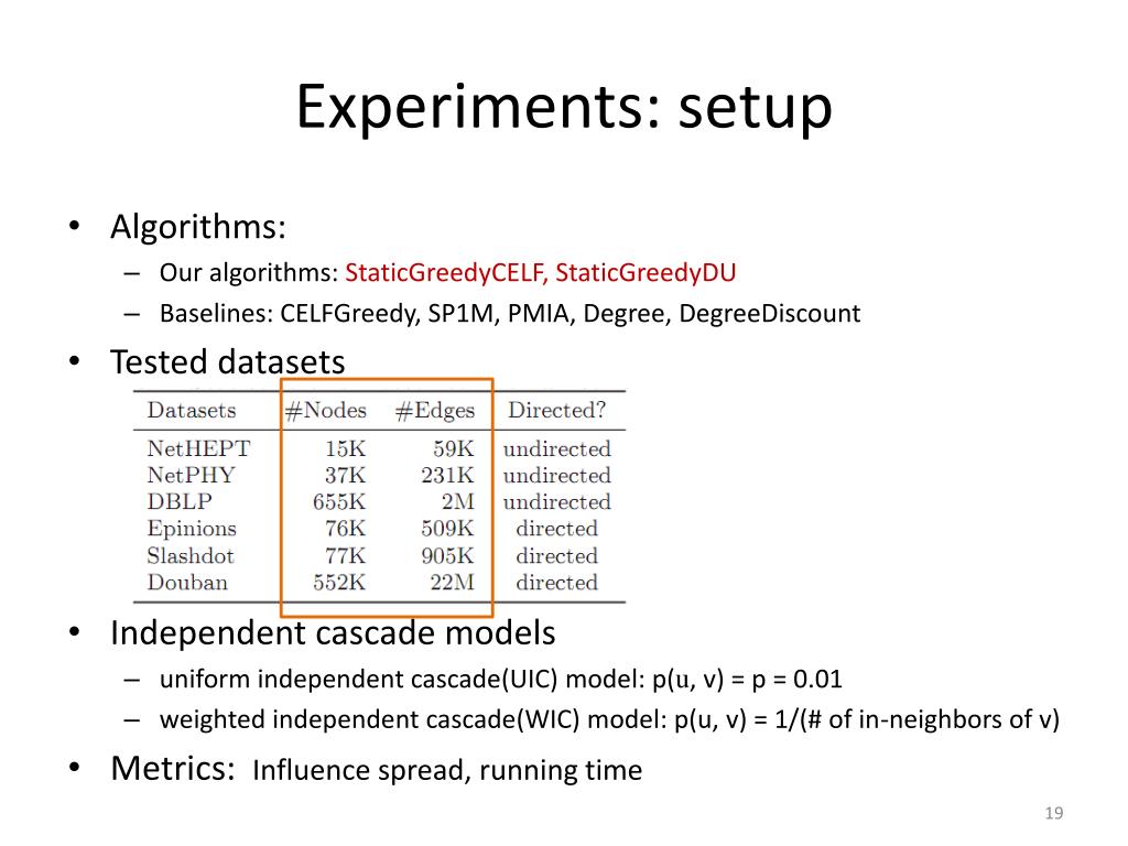 Experiments: setup • Algorithms: • Our algorithms: StaticGreedyCELF, StaticGreedyDU • Baselines: CELFGreedy, SP1M, PMIA, Degree, DegreeDiscount • Tested datasets • Independent cascade models • uniform independent cascade(UIC) model: p(u, v) = p = 0.01 • weighted independent cascade(WIC) model: p(u, v) = 1/(# of in-neighbors of v) • Metrics: Influence spread, running time