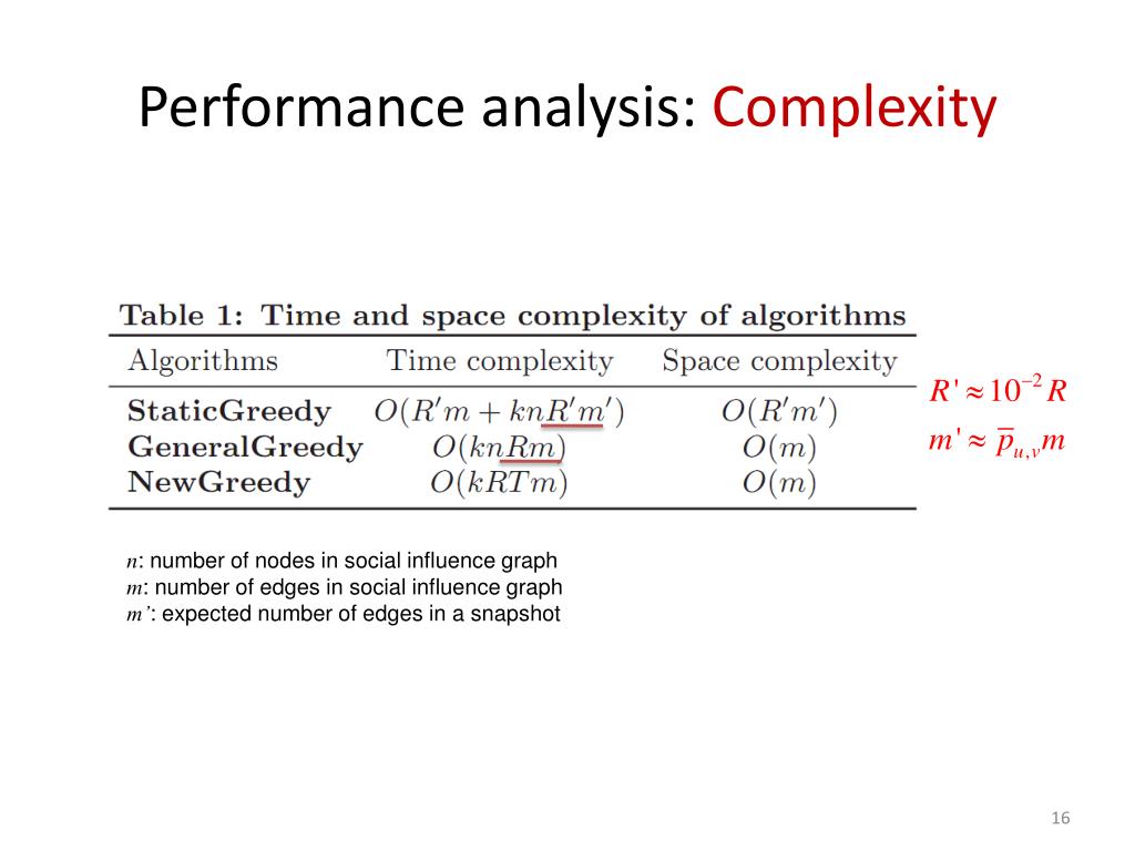 Performance analysis: Complexity n: number of nodes in social influence graph m: number of edges in social influence graph m’: expected number of edges in a snapshot