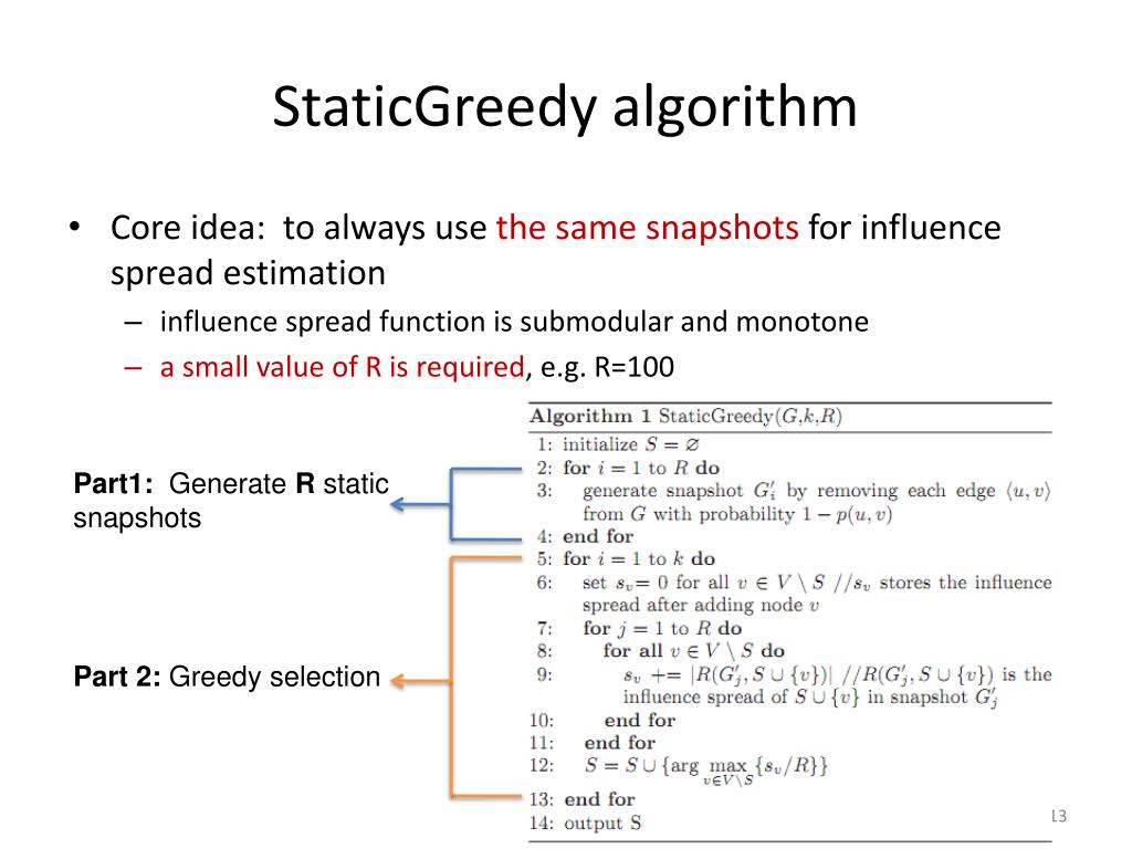 StaticGreedy algorithm • Core idea: to always use the same snapshots for influence spread estimation • influence spread function is submodular and monotone • a small value of R is required, e.g. R=100 Part1: Generate R static snapshots Part 2: Greedy selection