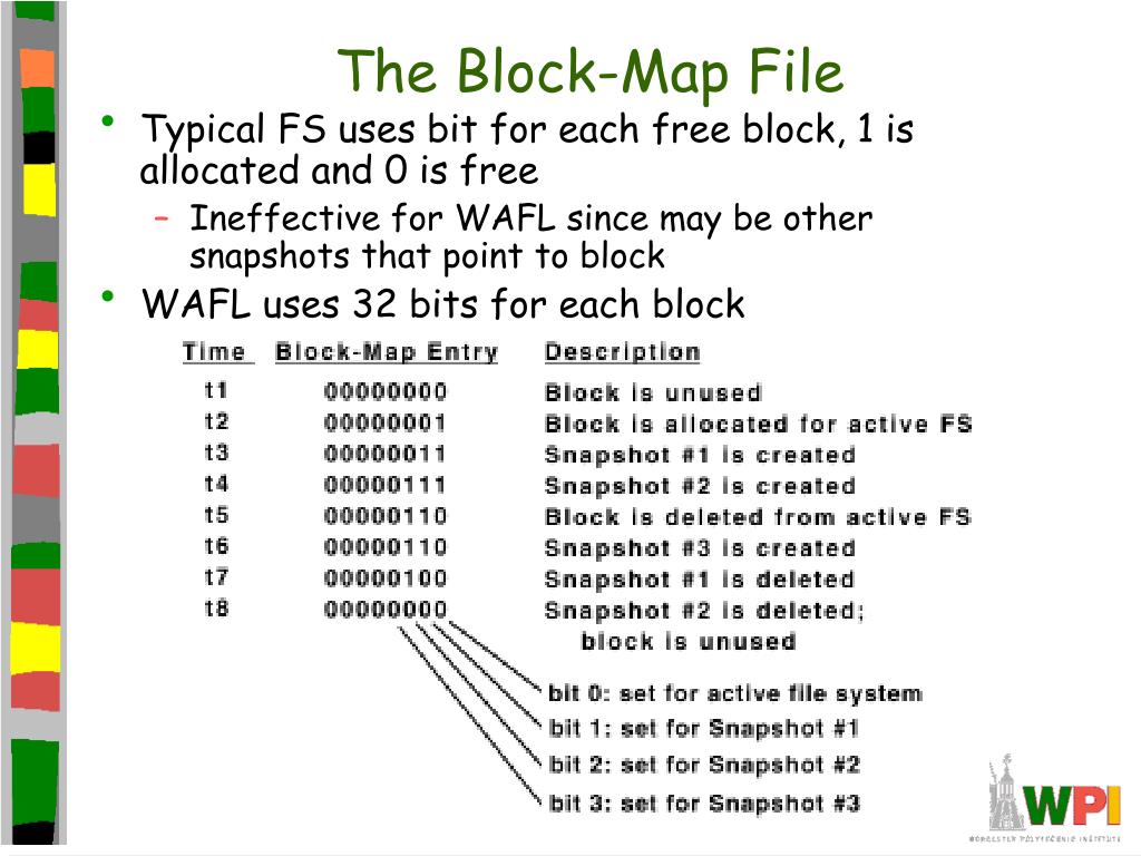 The Block-Map File • Typical FS uses bit for each free block, 1 is allocated and 0 is free • Ineffective for WAFL since may be other snapshots that point to block • WAFL uses 32 bits for each block