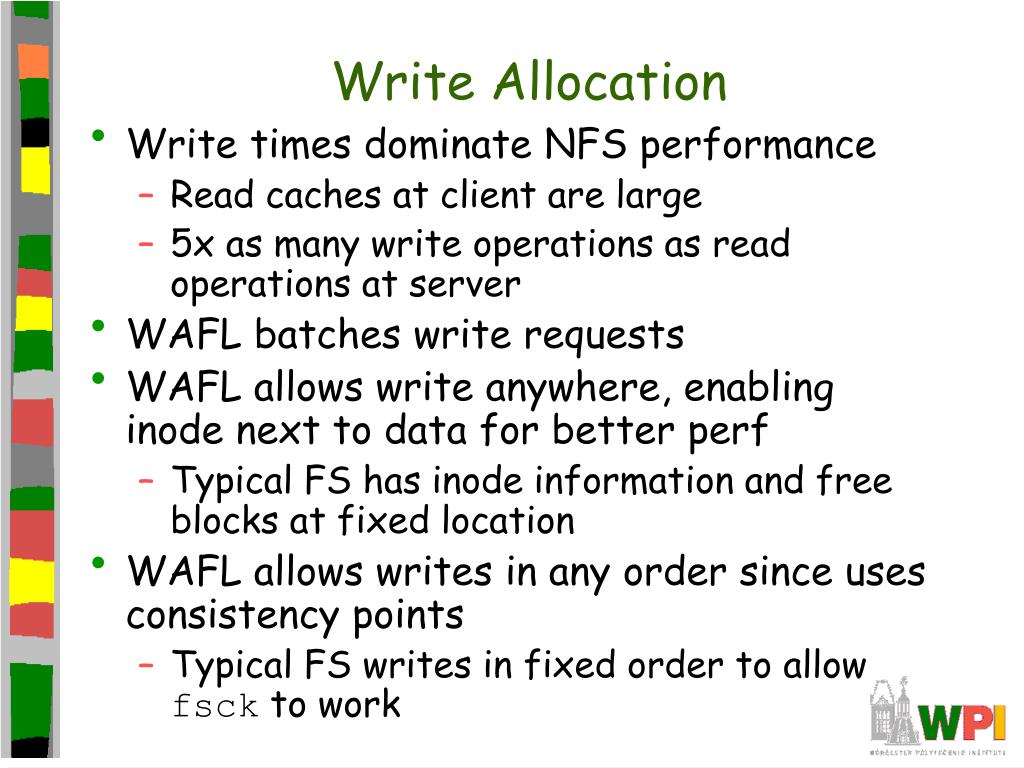 Write Allocation • Write times dominate NFS performance • Read caches at client are large • 5x as many write operations as read operations at server • WAFL batches write requests • WAFL allows write anywhere, enabling inode next to data for better perf • Typical FS has inode information and free blocks at fixed location • WAFL allows writes in any order since uses consistency points • Typical FS writes in fixed order to allow fsck to work