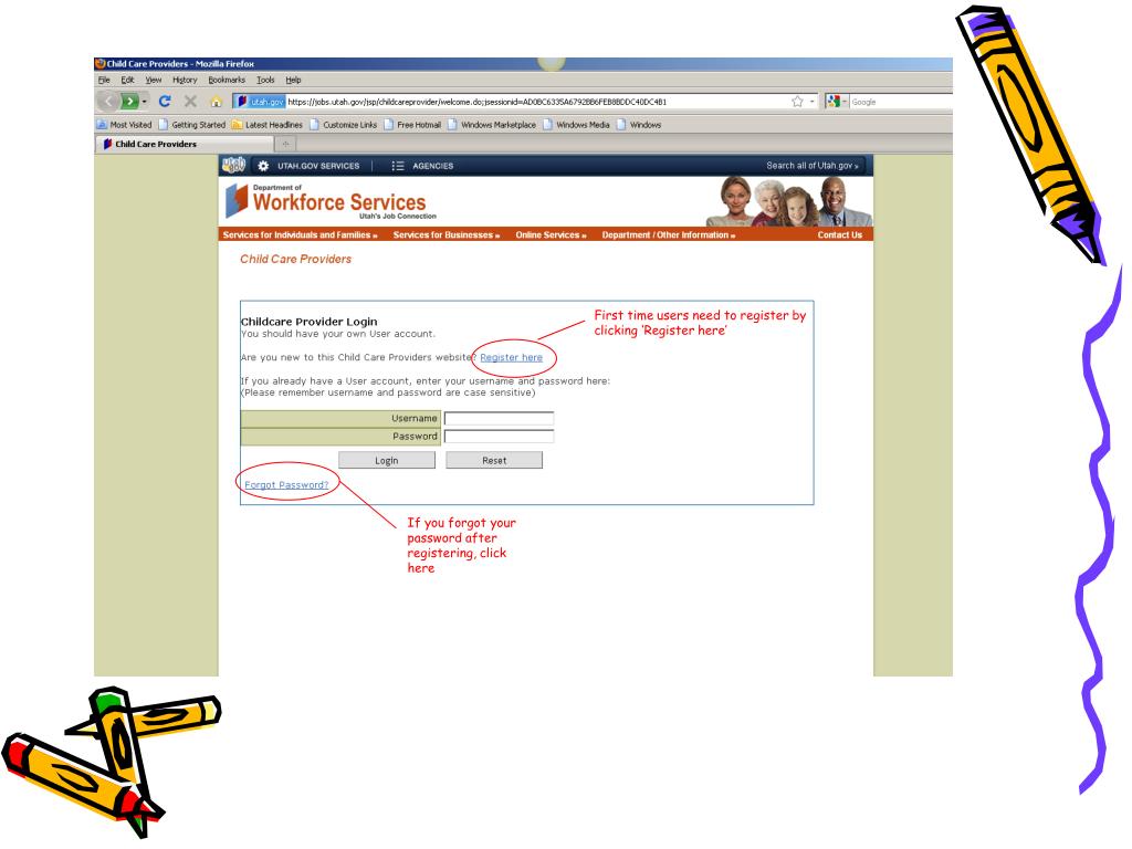 Using the Website • The provider website is located at http://jobs.utah.gov/jsp/childcareprovider/ • First time users must register before accessing the website. • To register and get a login and PIN, first call the DWS Provider Helpline at (866) 435-7414. • Click on the ‘Register here’ link on the Childcare provider login screen.