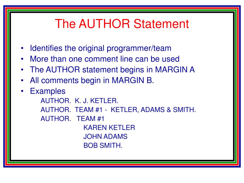 The AUTHOR Statement • Identifies the original programmer/team • More than one comment line can be used • The AUTHOR statement begins in MARGIN A • All comments begin in MARGIN B. • Examples • AUTHOR. K. J. KETLER. • AUTHOR. TEAM #1 - KETLER, ADAMS & SMITH. • AUTHOR. TEAM #1 • KAREN KETLER • JOHN ADAMS • BOB SMITH.