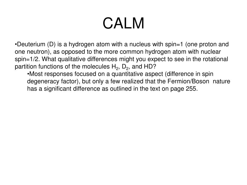 CALM • Deuterium (D) is a hydrogen atom with a nucleus with spin=1 (one proton and one neutron), as opposed to the more common hydrogen atom with nuclear spin=1/2. What qualitative differences might you expect to see in the rotational partition functions of the molecules H2, D2, and HD? • Most responses focused on a quantitative aspect (difference in spin degeneracy factor), but only a few realized that the Fermion/Boson nature has a significant difference as outlined in the text on page 255.