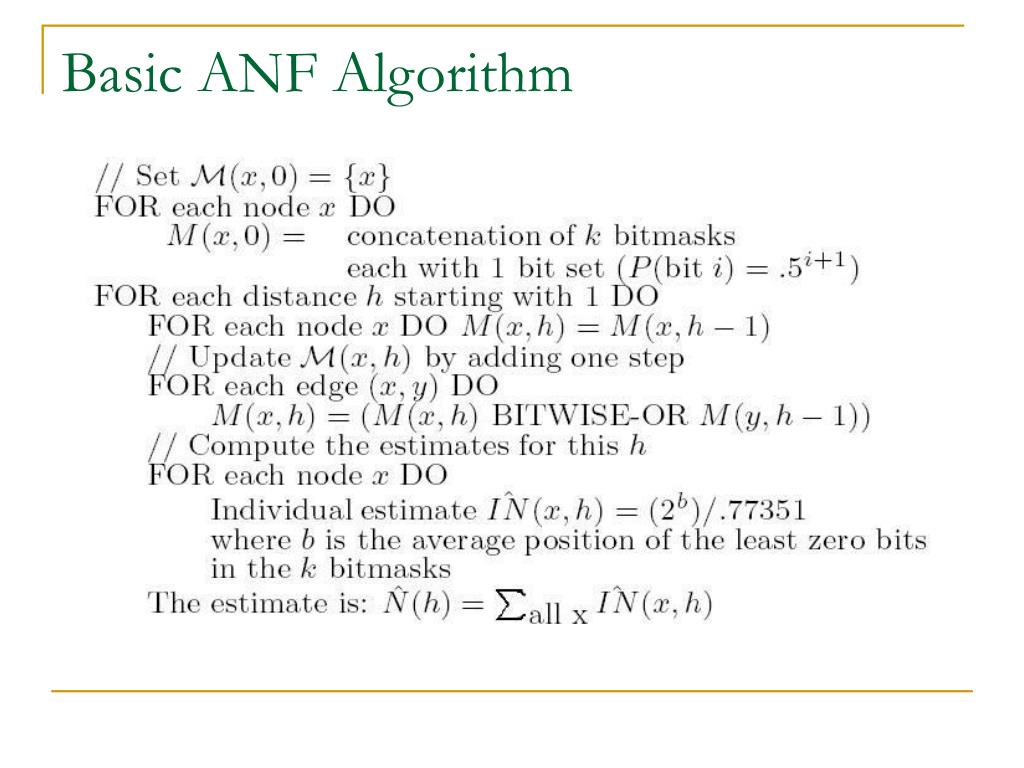 Basic ANF Algorithm • How to compute the number of distinct elements in the set M(x,h): • A dictionary data structure: O(n2log n) time/space • Use bits to mark membership: O(n2) space • Use ‘probabilistic counting algorithm’ • Approximate set sizes using ‘log n+r’ bits