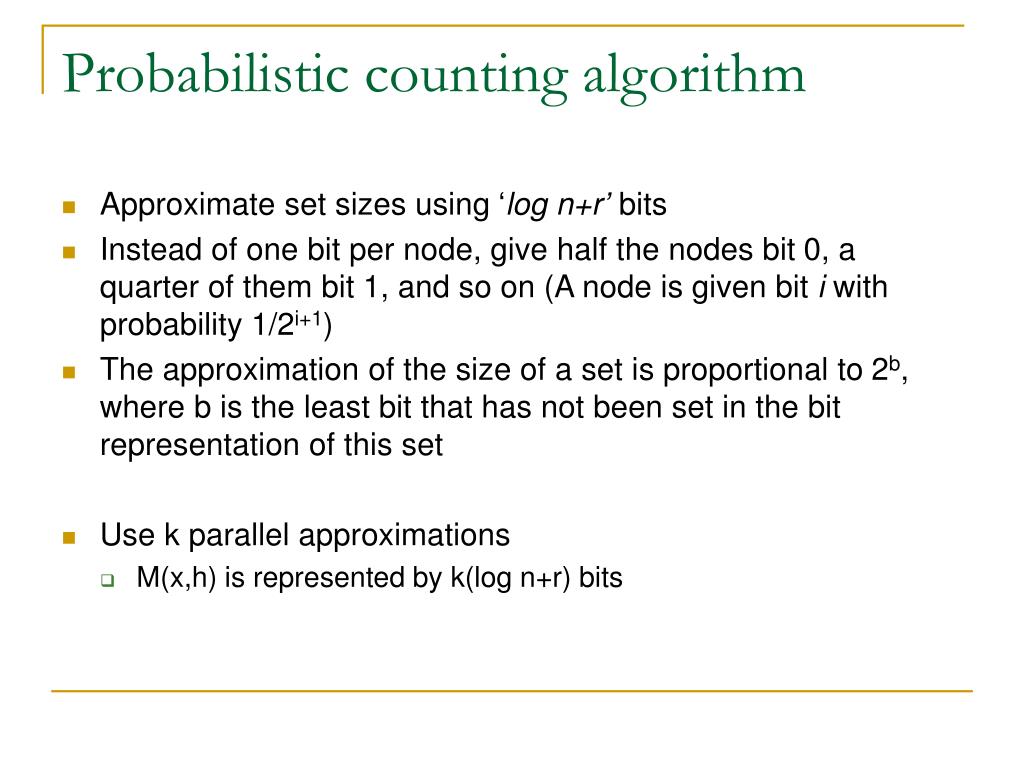 Probabilistic counting algorithm • Approximate set sizes using ‘log n+r’ bits • Instead of one bit per node, give half the nodes bit 0, a quarter of them bit 1, and so on (A node is given bit i with probability 1/2i+1) • The approximation of the size of a set is proportional to 2b, where b is the least bit that has not been set in the bit representation of this set • Use k parallel approximations • M(x,h) is represented by k(log n+r) bits
