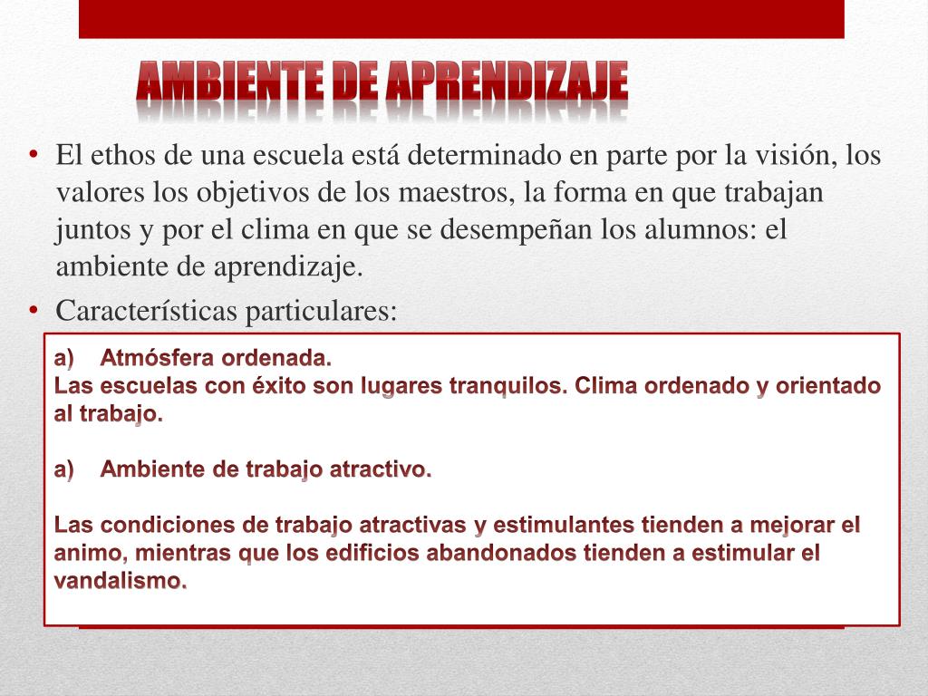 Ambiente de aprendizaje • El ethos de una escuela está determinado en parte por la visión, los valores los objetivos de los maestros, la forma en que trabajan juntos y por el clima en que se desempeñan los alumnos: el ambiente de aprendizaje. • Características particulares: Atmósfera ordenada. Las escuelas con éxito son lugares tranquilos. Clima ordenado y orientado al trabajo. Ambiente de trabajo atractivo. Las condiciones de trabajo atractivas y estimulantes tienden a mejorar el animo, mientras que los edificios abandonados tienden a estimular el vandalismo.