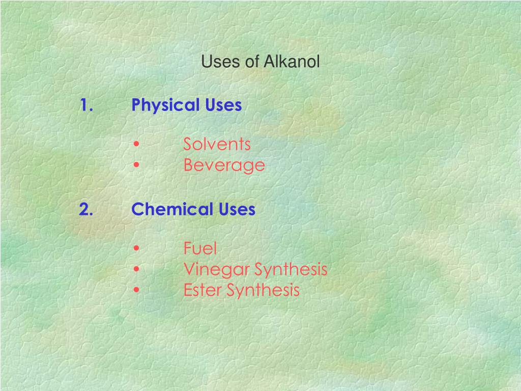 Uses of Alkanol 1. Physical Uses • Solvents • Beverage 2. Chemical Uses • Fuel • Vinegar Synthesis • Ester Synthesis
