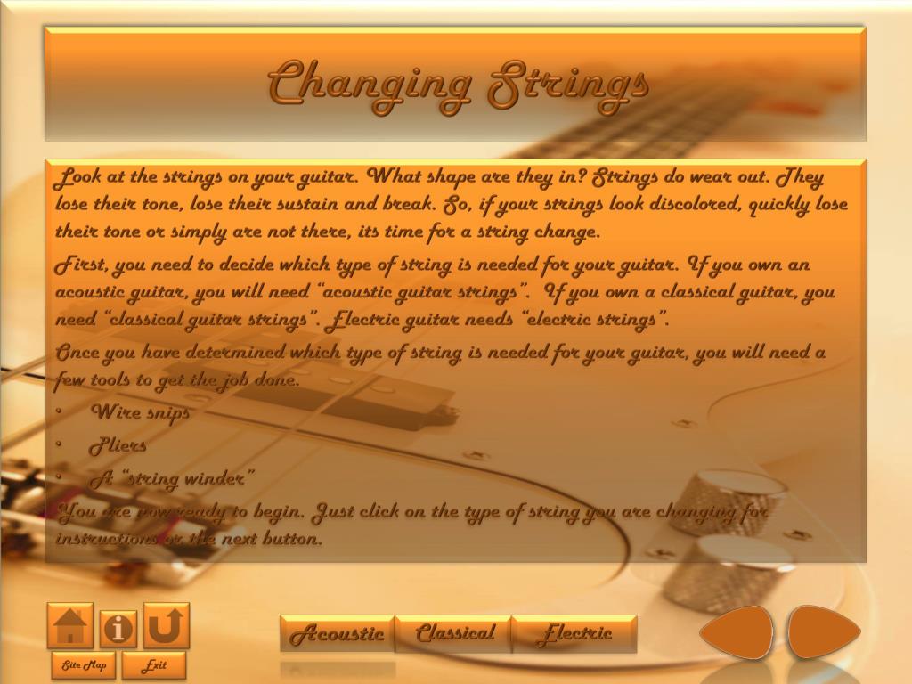 Site Map Main Menu Changing Strings Tuning the Guitar Adjust the Action Acoustic Electronic Truss Rod Classical Reference Bridge (Nut) Electric Relative Bridge (Saddle) Information Site Map Exit